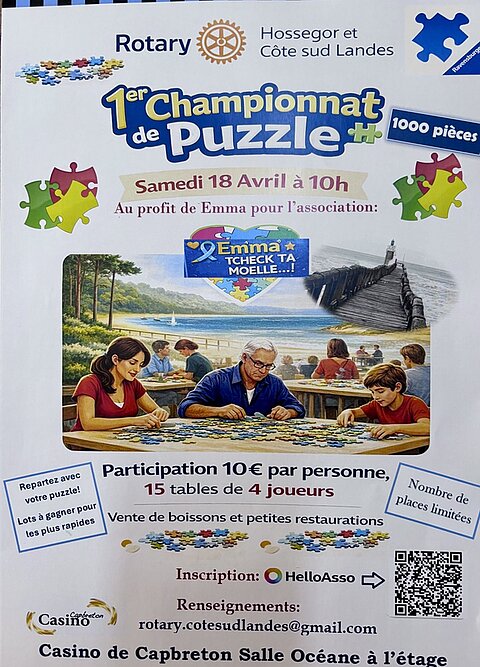 Notre Rotary club hossegor et côte sud Landes organise le championnat de puzzle au profit de l’association d’Emma « Tchèque ta Moelle « Emma partira en vélo jusqu’en Tchéquie pour aller remercier son donneur et promouvoir l’intérêt de donner sa moelle chez les jeunes par une simple prise de sang.voilà l’objectif de son association