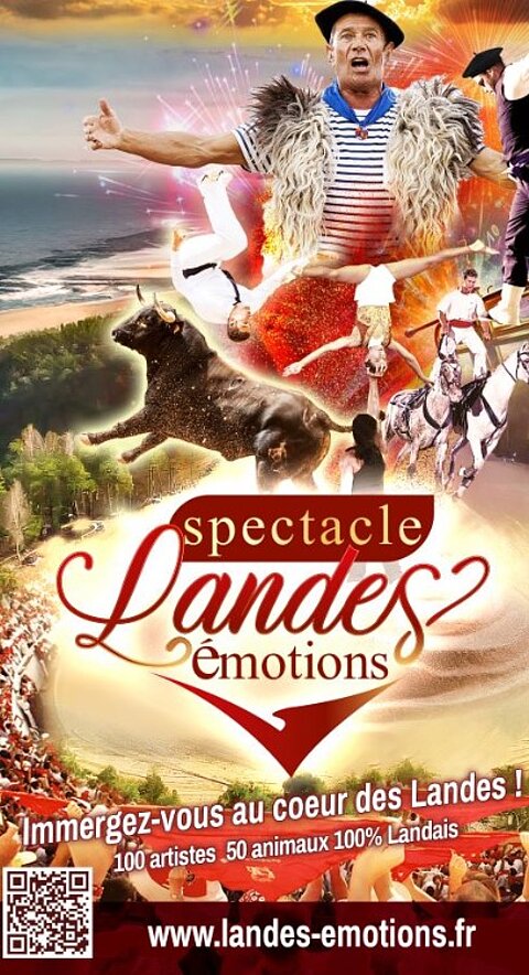 Immergez-vous au coeur des landes avec la cinéscénie landaise ! Landes Emotions vous propose un concentré de richesse de notre département, à travers une programmation authentique, dynamique et spectaculaire. Partagez des moments de cultures, d'émotions, de frissons et de traditions. Plus de 100 artistes et de 40 animaux 100% landais pour une grande soirée son, lumières et pyrotechnie à partager en famille ou entre amis. Unique spectacle à avoir obtenu le label "Landes terre des possible".