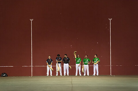 2 équipes de 3 joueurs de pelote basque au grand chistera (grand gant d'osier) disputeront un match en 30 points.