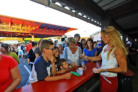 Au buffet : cuisses de canard, sardines, merguez, ventrêche, coeurs de canards, frites, pâtisseries, glaces, etc..