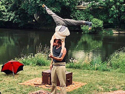Passages est un duo de rue burlesque, une rencontre entre deux voyageurs cherchant refuge avec leurs maigres affaires. Lui, fuyant frontière et tempête, elle, vagabonde, esquivant le vacarme du monde, sa maison sur le dos. Ces deux voyageurs cherchent séparément un endroit pour poser leurs fardeaux mais chacun constate avec étonnement que leur nouvel havre de paix est déjà occupé par l’autre. C’est par le rire et la poésie que ce spectacle aborde les thèmes de l’exil et de la rencontre, ainsi que la dualité féminin/masculin.