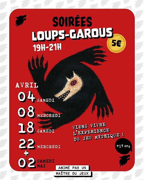 Venez participer à une partie géante (16 participants) du jeu Loups-Garous. Accompagnés et guidés par un maître du jeu, vous incarnez un personnage et tenter de survivre à chaque nuit. Les suspicions et les débats rendent les parties et les échanges entre les joueurs très animés !