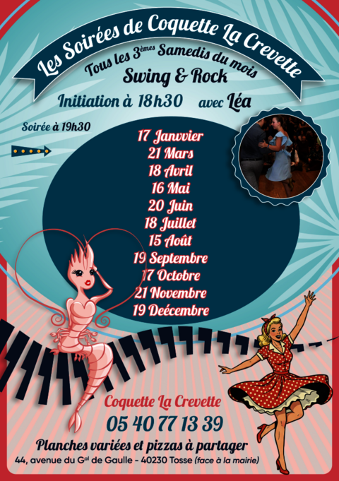 18h30 – Initiation au Swing : Animée par Léa de l’association Land’danse (Saint-Vincent-de-Tyrosse), cette séance permettra aux débutants de découvrir les pas de base et aux initiés de parfaire leur style avant l'ouverture de la soirée.