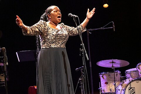 Bridget Bazile chant Vincent Balse piano Théo Fardèle basse Matthieu Chazarenc batterie Monique Thomas chœurs