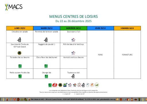 - par chèque : les familles qui le souhaitent peuvent déposer leur chèque au Pôle culinaire ou adresser leurs règlements par courrier à l’ordre du Régisseur du Pôle Culinaire, Pôle culinaire de MACS – 199 rue du courant d'Huchet - 40 230 SAINT-GEOURS-DE-MAREMNE