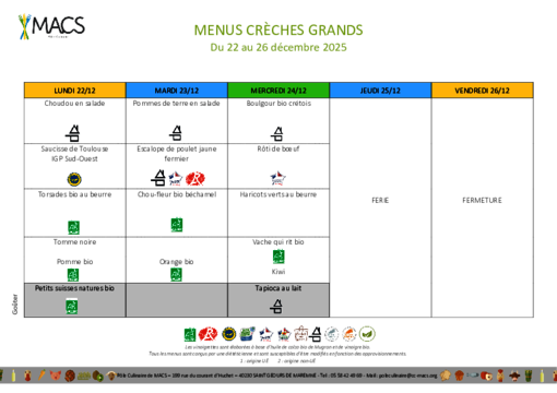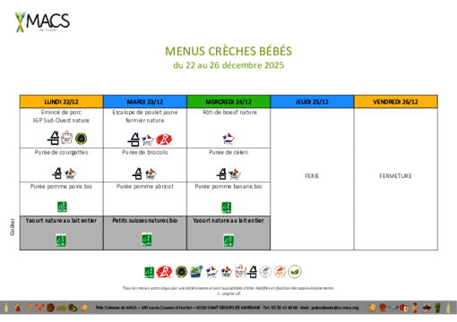 Menus : crèches, écoles, centre de loisirs, EHPAD