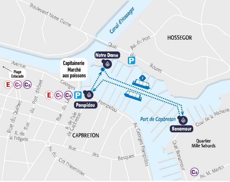 Le bateau passeur "e-boucarot" est à propulsion 100 % électrique pouvant accueillir 35 passagers, vélos, poussettes et planches de surf. Ce catamaran de 10 mètres de long et 4 mètres de large aura pour mission d'assurer près de 16 000 traversées dans le port de Capbreton pendant la période estivale.